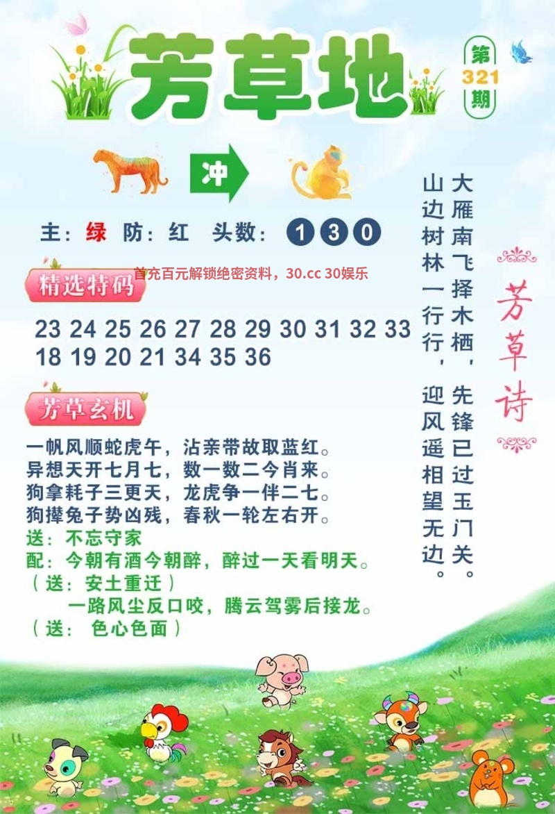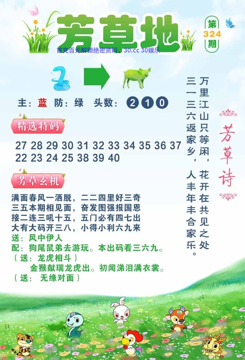 | 324期芳草玄机:满面春风一洒脱,二二四里好三奇。三五本期相见面,奋发图强报国恩。接二连三吼十五,五门必有四七出。大有大码开三八,小得小利六九来。 芳草诗:万里江山只等闲,花开在共见之处。三一三六返家乡,人丰年丰合家乐。 波色:蓝绿 头数:210 |