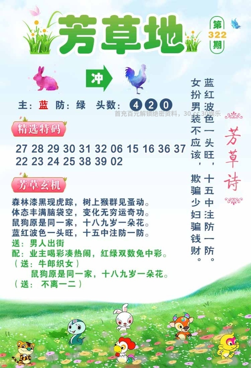 | 322期芳草玄机:森林漆黑现虎踪,树上猴群见蚤动。体态丰满脑袋空,变化无穷运奇功。鼠狗原是同一家,十八九岁一朵花。蓝红波色一头旺,十五中注防一防。 芳草诗:蓝红波色一头旺,十五中注防一防。女扮男装不应该,欺骗少妇骗钱财。 特肖:猴马鼠羊龙兔狗 波色:蓝绿 头数:420 |